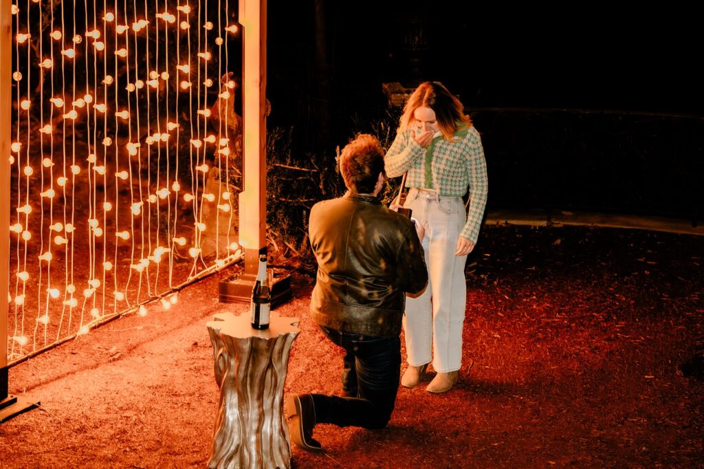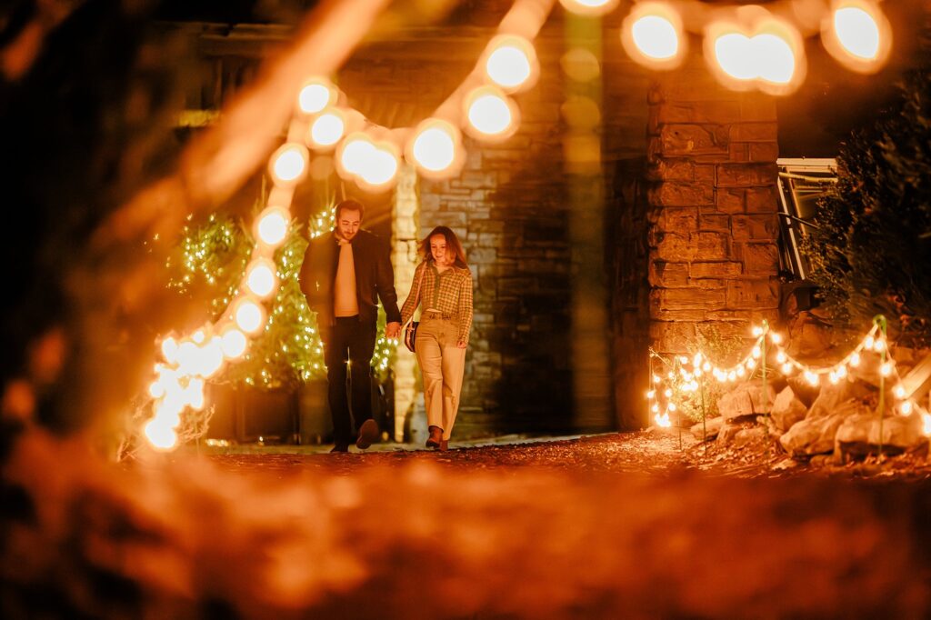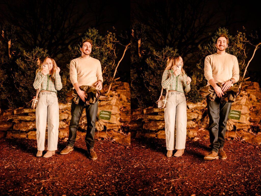 We arrived early, scoped out the perfect proposal spot, and tucked ourselves completely out of sight. We watched as the couple wandered through Cheekwood’s holiday lights. From a distance, they looked like any other couple enjoying a festive winter night in Nashville, unaware that a life-changing moment was just minutes away.